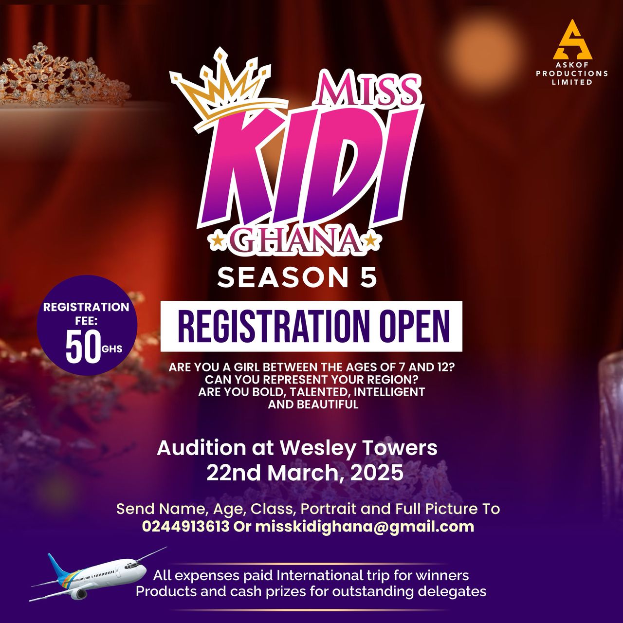 📍 Venue: Wesley Towers, Accrađź“… Date: 22nd March, 2024 Miss Kidi Ghana Season 5 is here, and we’re on the lookout for young, confident, and talented girls ready to shine!…